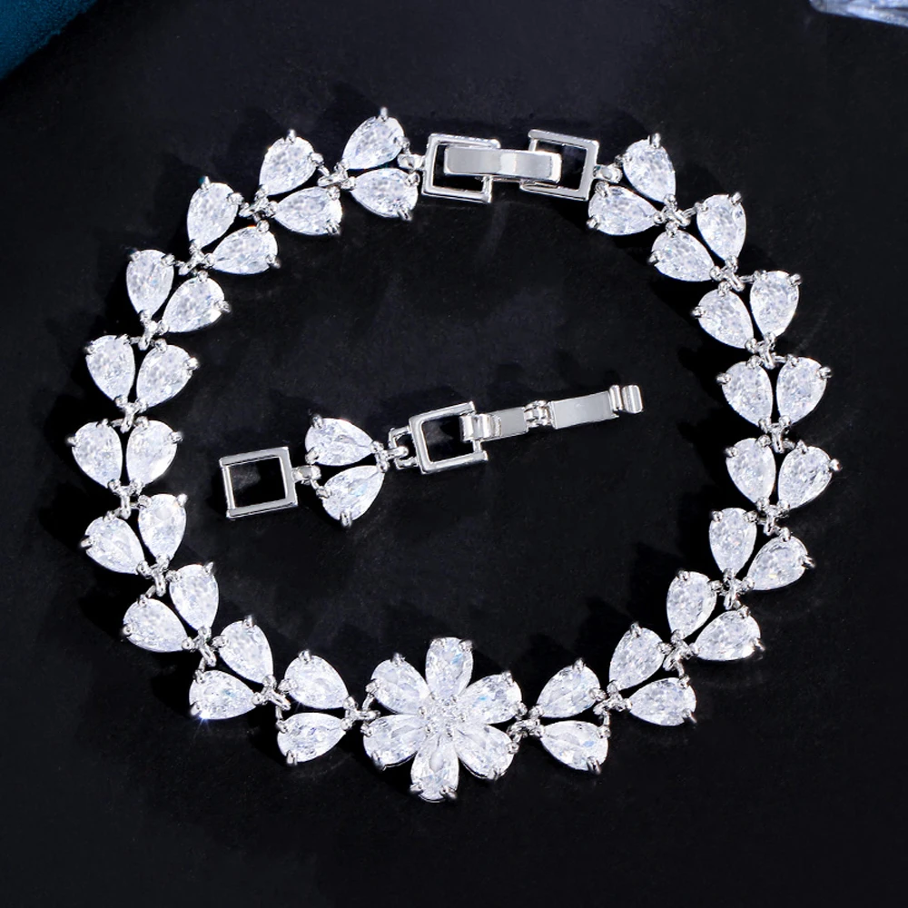 اشتر أساور تنس الزفاف المصنوعة من حجر الزركونيا المكعب المقطوع على شكل قطرات ماء باللون الأبيض اللامع مع زهرة لإكسسوارات الزفاف من منتجات المجوهرات والنظارات والساعات والإكسسوارات من مصنع الصين مباشرة عبر الرابط