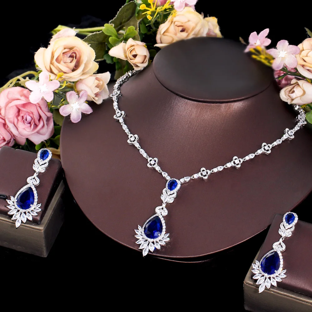 أقراط زفاف طويلة متدلية من الزركون المكعب باللون الأزرق الملكي الأنيق، مجموعات مجوهرات لحفلات الزفاف المسائية للنساء