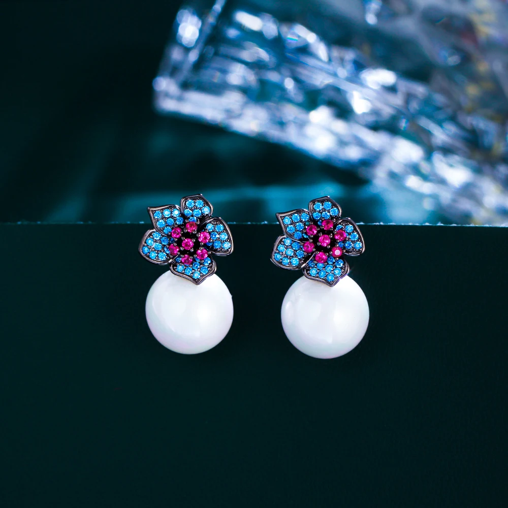 اشتر أقراط متدلية رائعة من الزركون الأزرق الوردي المطلي باللون الأسود على شكل زهرة حفلات بيضاء كبيرة من اللؤلؤ لإكسسوارات هدايا الفتيات من منتجات المجوهرات والنظارات والساعات والإكسسوارات من مصنع الصين مباشرة عبر الرابط