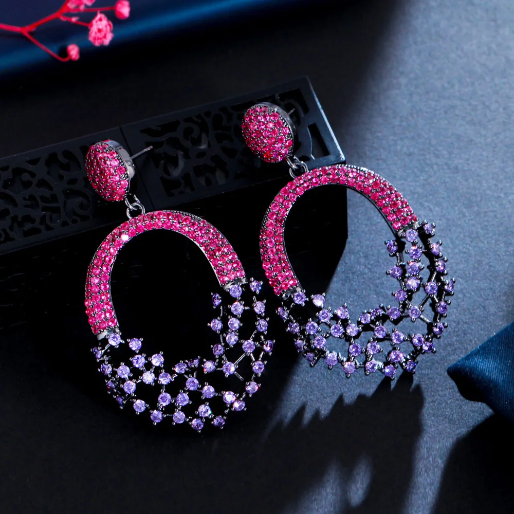 أقراط متدلية كبيرة أنيقة مجوفة من حجر الزركونيا الأحمر الأرجواني مرصعة بالكريستال لخطوبة الزفاف للنساء
