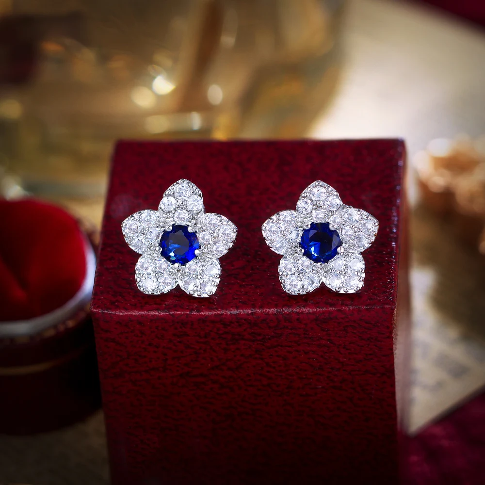 اشتر أقراط مرصعة بالزركونيا المكعبة الأنيقة لحفلات المواعيد، أقراط زرقاء صغيرة مزينة بالزهور للنساء للارتداء اليومي من منتجات المجوهرات والنظارات والساعات والإكسسوارات من مصنع الصين مباشرة عبر الرابط