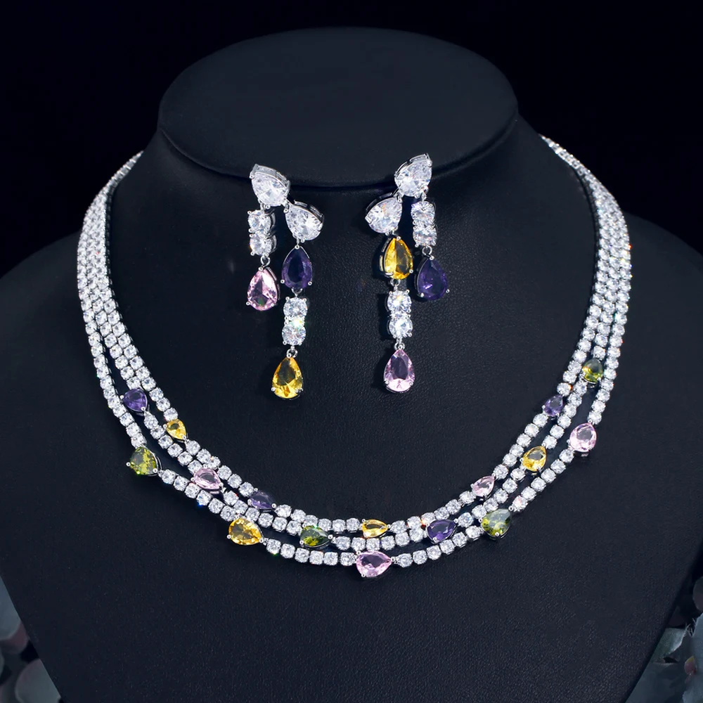مجموعة أقراط وقلادات حفلات نسائية مطلية بالفضة مكونة من 3 طبقات ومتعددة الألوان من الزركونيا المكعبة على شكل قطرة ماء لحفلات الزفاف