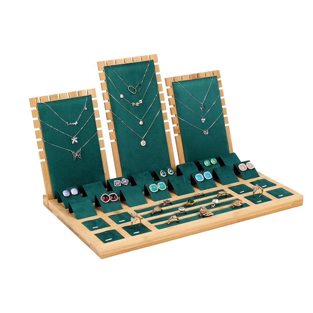 مجموعة حامل عرض المجوهرات المخملية الخضراء، قلادة فاخرة من الخيزران، صينية عرض المجوهرات لمتجر المجوهرات