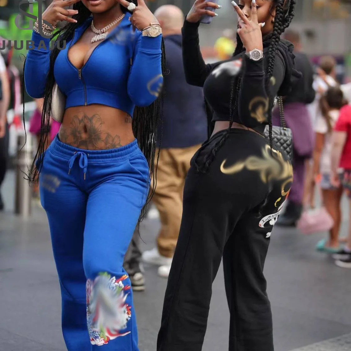 اشتر بدلة رياضية نسائية شتوية وخريفية مطبوعة بسحاب وغطاء للرأس ورباط طويل فضفاض مكون من قطعتين من منتجات الملابس والاكسسوارات من مصنع الصين مباشرة عبر الرابط
