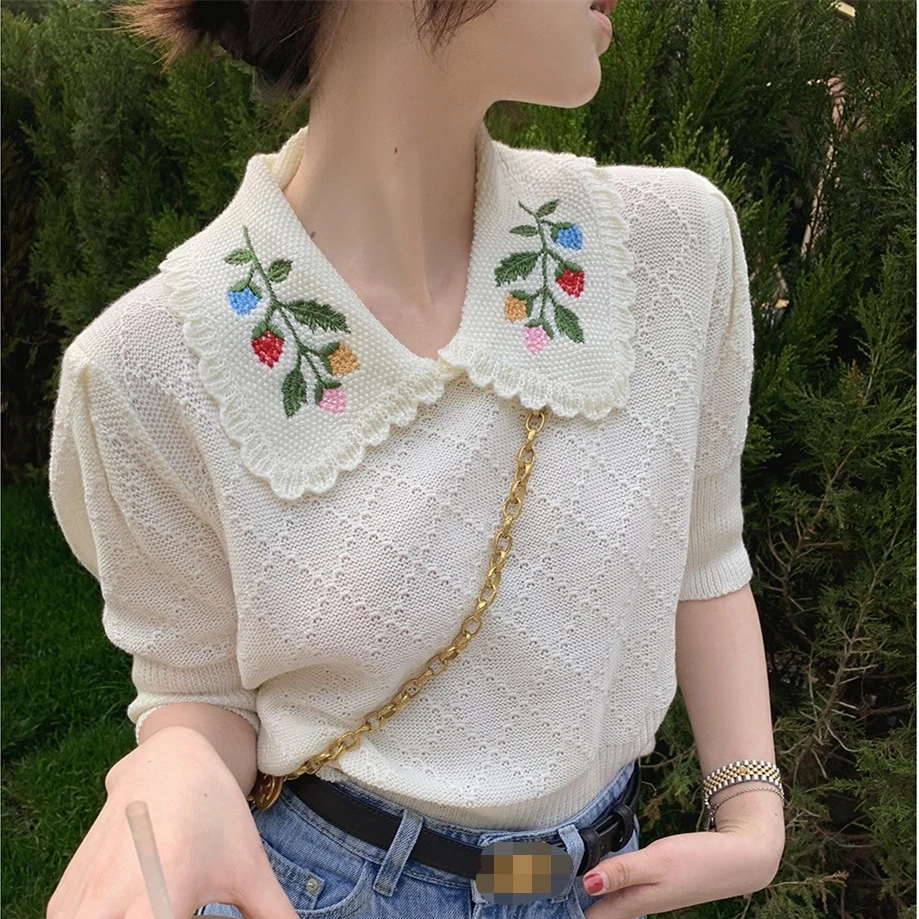 اشتر تي شيرت نسائي صيفي بأكمام قصيرة وسويت شيرت رقيق مطرز بياقة دمية وقميص قصير محبوك قديم للنساء تي شيرت محبوك من منتجات الملابس والاكسسوارات من مصنع الصين مباشرة عبر الرابط