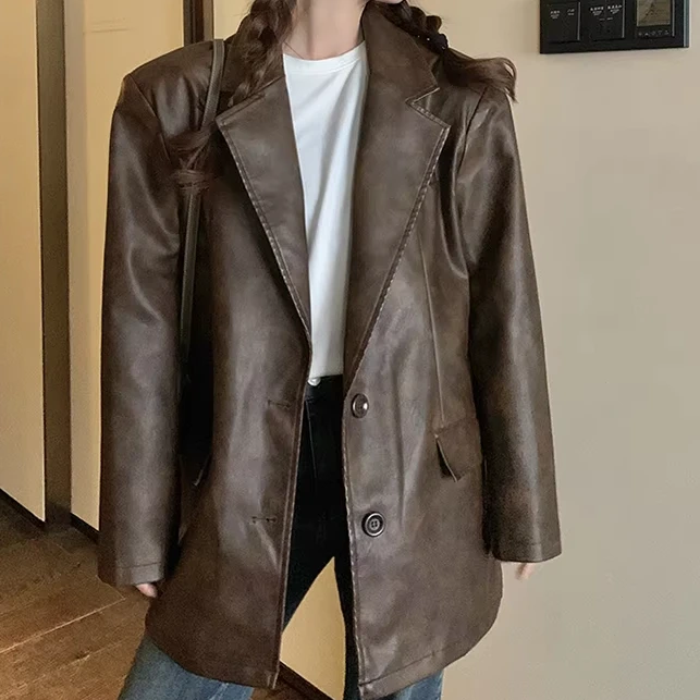 اشتر سترة بدلة خريفية جديدة من OUDINA بلون سادة فضفاضة متعددة الاستخدامات مصنوعة من جلد البولي يوريثان الثقيل للنساء من منتجات الملابس والاكسسوارات من مصنع الصين مباشرة عبر الرابط