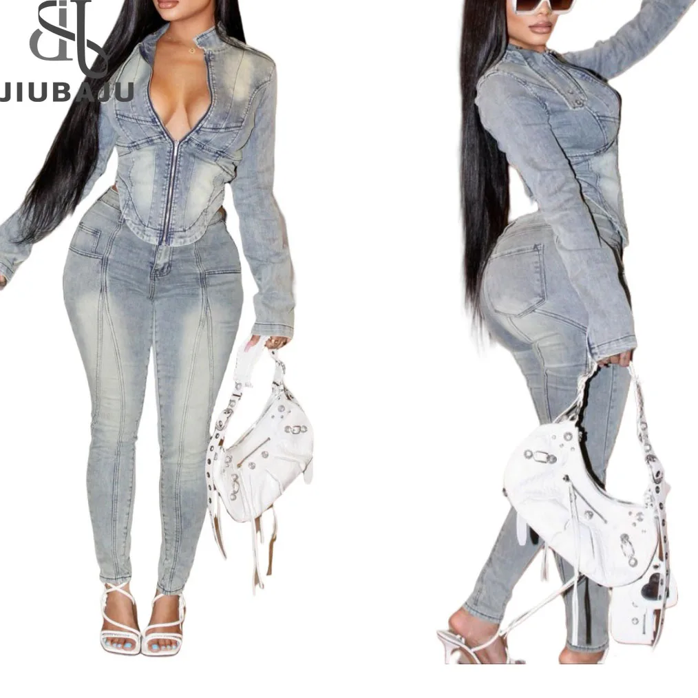 اشتر طقم جينز نسائي بأكمام طويلة وسحاب لخريف 2024، طقم بنطلون جينز مطاطي مكون من قطعتين للنساء من منتجات الملابس والاكسسوارات من مصنع الصين مباشرة عبر الرابط