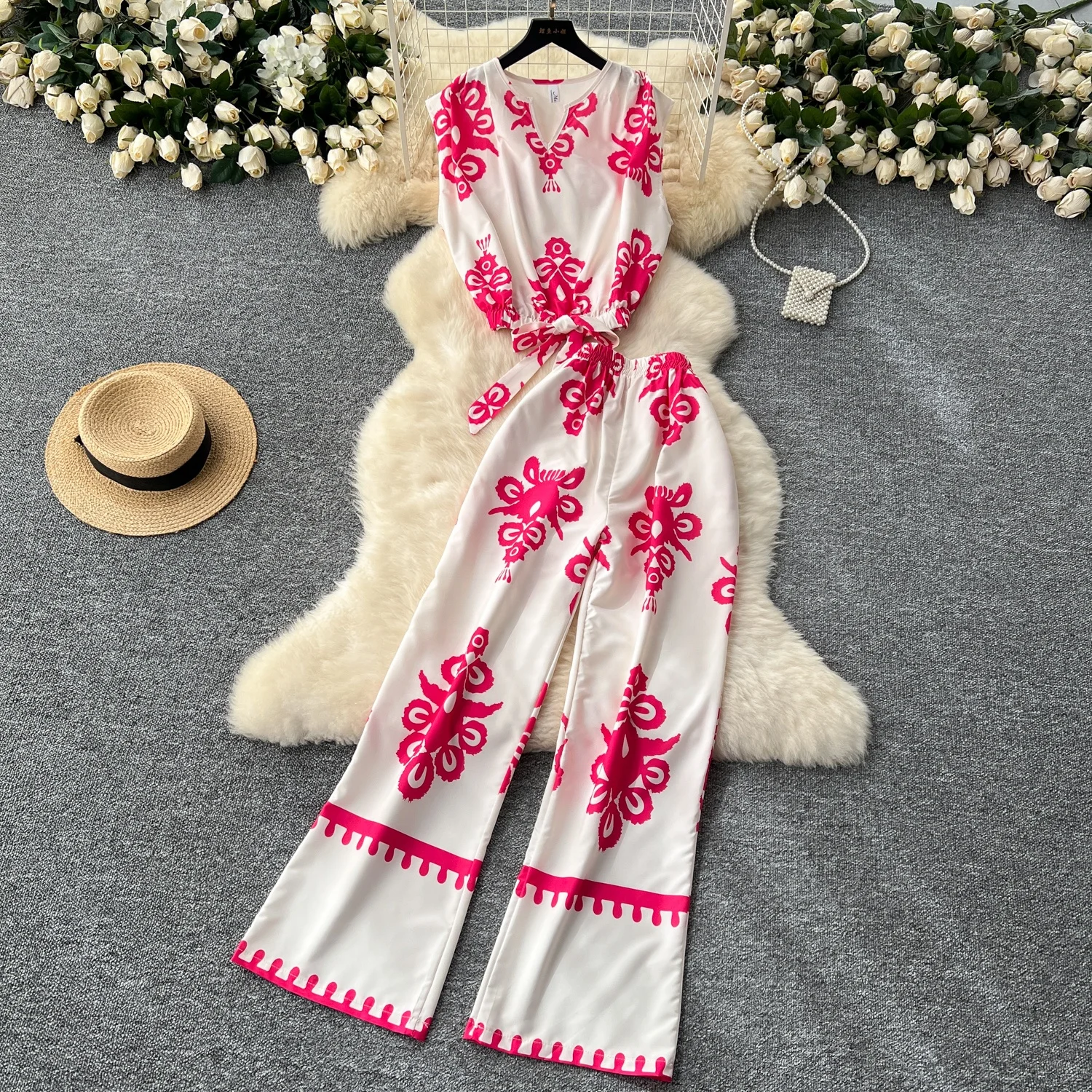 اشتر طقم سراويل نسائية كاجوال واسعة الساق بدون أكمام بخصر ربطة عنق ورقبة على شكل حرف V من منتجات الملابس والاكسسوارات من مصنع الصين مباشرة عبر الرابط