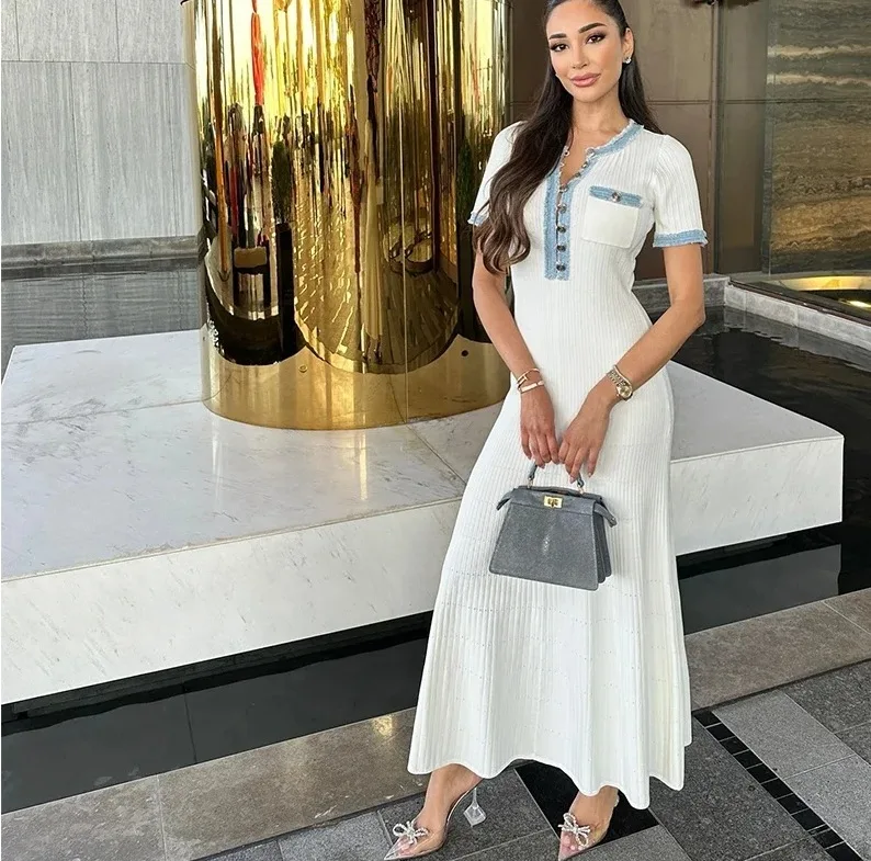 اشتر فساتين نسائية طويلة أنيقة بأكمام قصيرة ومحبوكة بتصميم شائع من منتجات الملابس والاكسسوارات من مصنع الصين مباشرة عبر الرابط