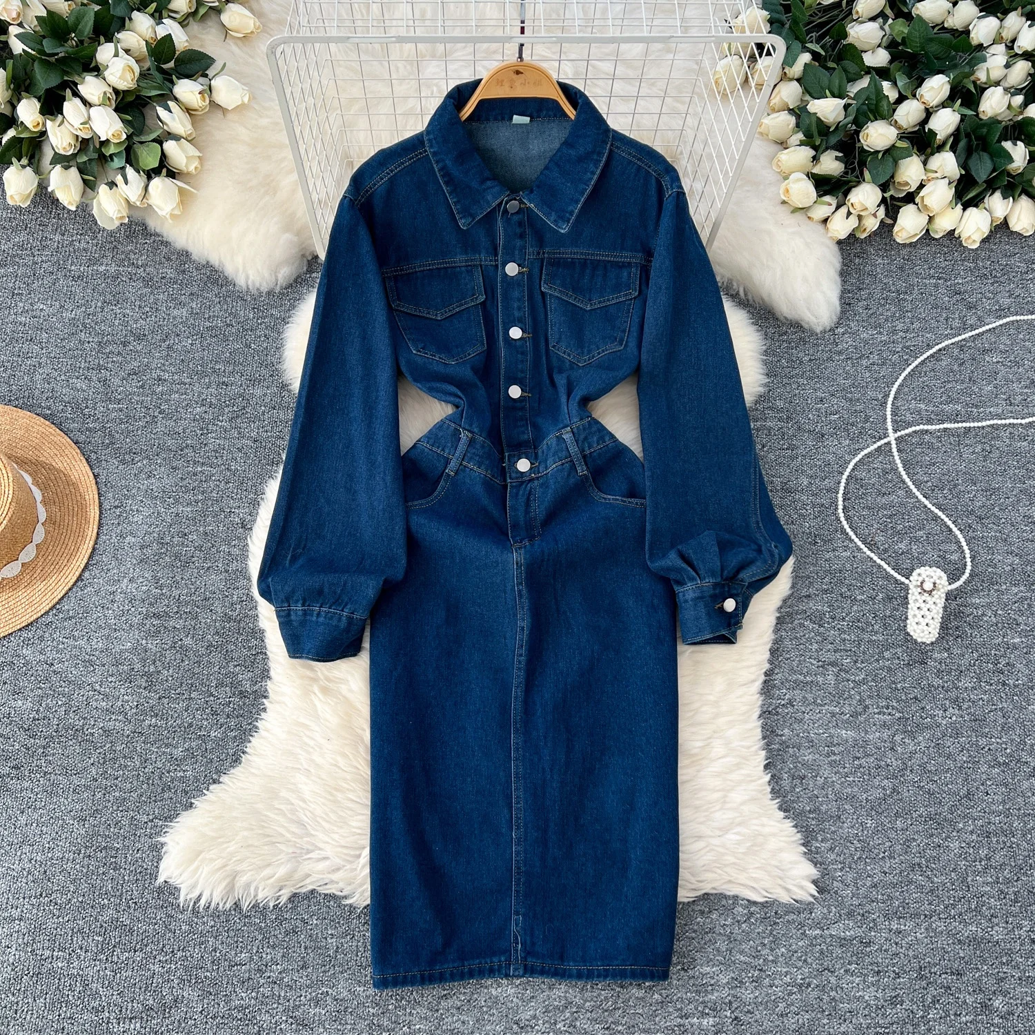 اشتر فستان جينز نسائي من أزياء الخريف العتيقة بأكمام طويلة وحزام علوي منقسم نحيف من منتجات الملابس والاكسسوارات من مصنع الصين مباشرة عبر الرابط