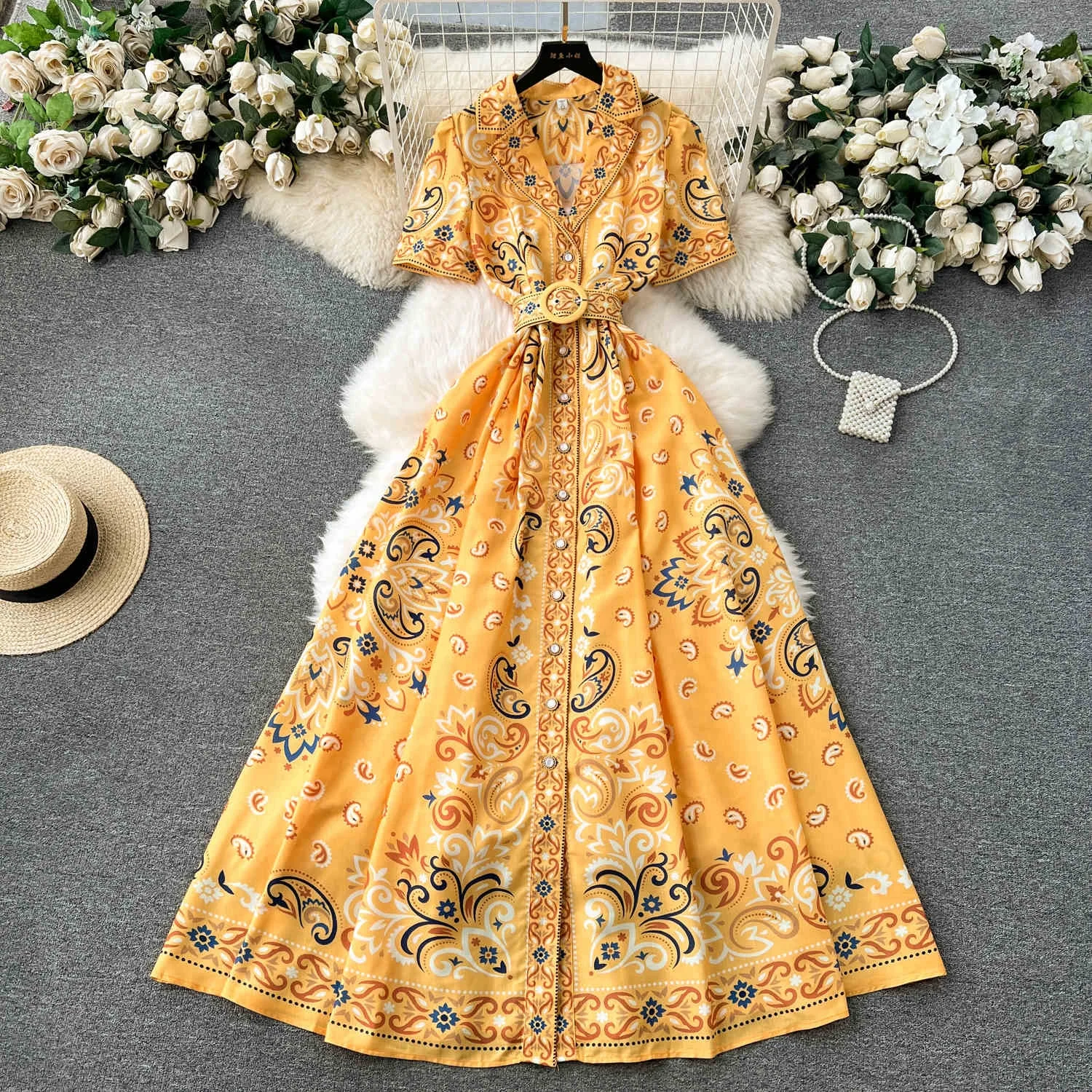 اشتر فستان ربيع وصيف عتيق برقبة على شكل حرف V وأكمام قصيرة وطباعة طويلة من منتجات الملابس والاكسسوارات من مصنع الصين مباشرة عبر الرابط