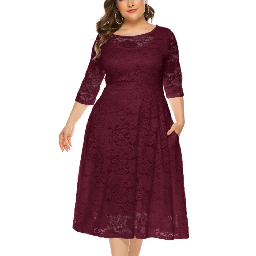 اشتر فستان سهرة أوروبي وأمريكي كبير مقاس XL-6XL فستان متوسط الطول مع جيب من الدانتيل المجوف ونصف كم من منتجات الملابس والاكسسوارات من مصنع الصين مباشرة عبر الرابط