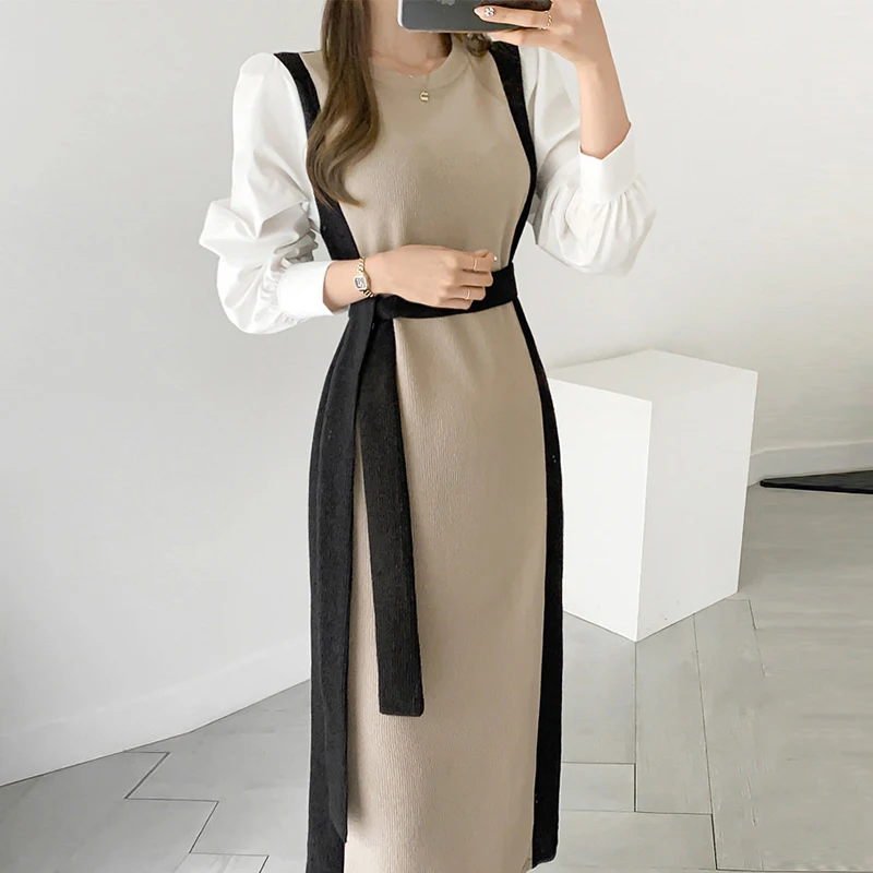 اشتر فستان محبوك بأكمام طويلة ورباط برقبة دائرية وخياطة بألوان متباينة لخريف وشتاء 2022 من منتجات الملابس والاكسسوارات من مصنع الصين مباشرة عبر الرابط