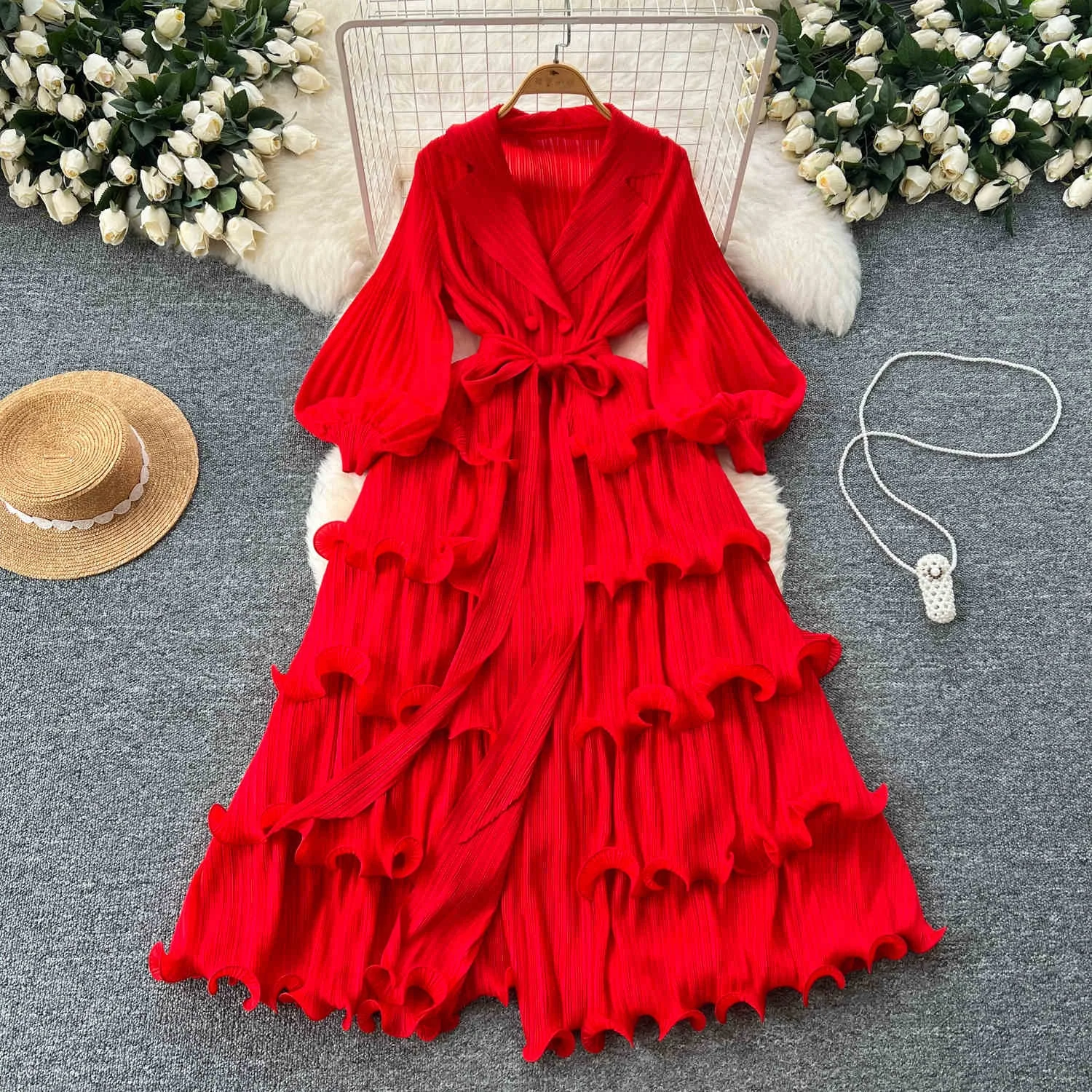 You are currently viewing فستان نسائي جديد لعام 2025 بياقة ياقة وأكمام فانوس وربطة خصر مكشكشة   فستان