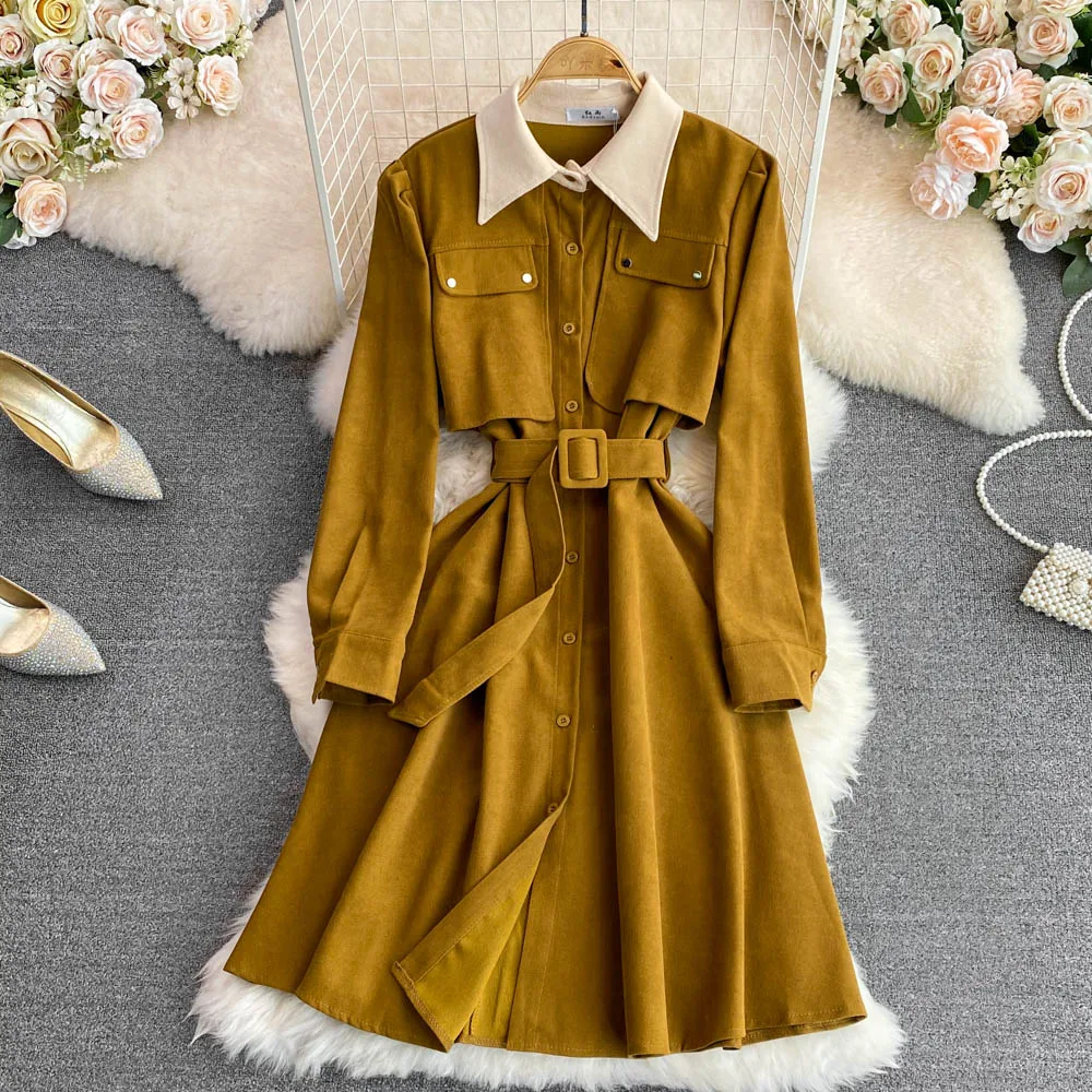 اشتر فستان نسائي كاجوال من قماش مخملي من قماش مخملي بياقة بولو وصدر واحد وخصر واحد من الخريف والشتاء من منتجات الملابس والاكسسوارات من مصنع الصين مباشرة عبر الرابط