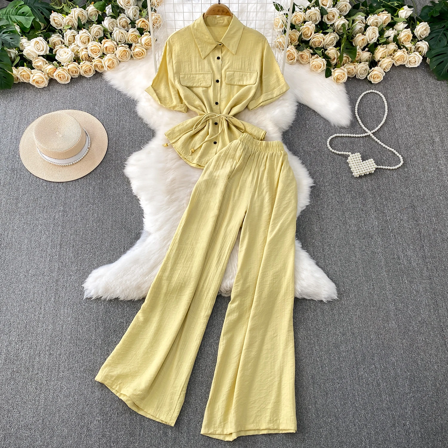 اشتر قميص عصري بأكمام قصيرة مع رباط علوي وبنطلون كاجوال واسع الساق بخصر مرتفع مكون من قطعتين من منتجات الملابس والاكسسوارات من مصنع الصين مباشرة عبر الرابط