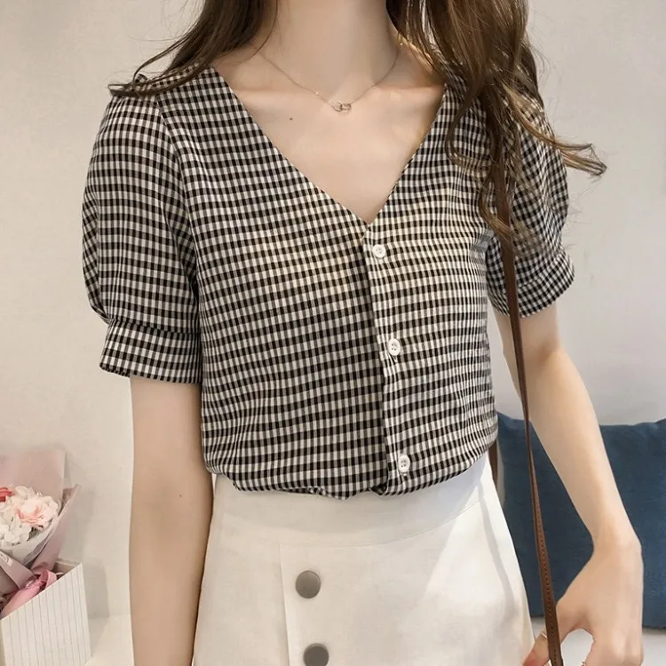 اشتر قميص نسائي صيفي 2022 منقوش برقبة على شكل حرف V وأكمام قصيرة وأزرار وقميص كوري رفيع شبكي كاجوال من منتجات الملابس والاكسسوارات من مصنع الصين مباشرة عبر الرابط