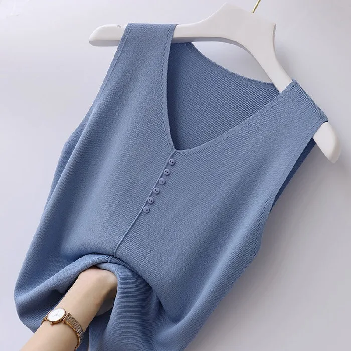 اشتر مجموعة صيف 2024 سترة نسائية محبوكة بأزرار وفتحة رقبة على شكل حرف V وحمالة من الحرير الجليدي قابلة للتنفس وسترة محبوكة رقيقة بدون أكمام من منتجات الملابس والاكسسوارات من مصنع الصين مباشرة عبر الرابط