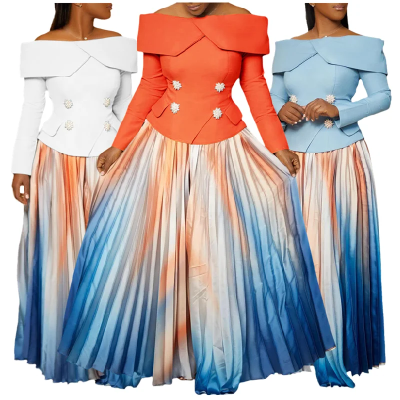 اشتر D3309 مجموعة ملابس نسائية أفريقية عصرية بأكمام طويلة وبلوزة أنيقة مكشوفة الكتفين + تنورة طويلة مصبوغة بربطة عنق، مجموعة من قطعتين، ملابس نسائية من منتجات الملابس والاكسسوارات من مصنع الصين مباشرة عبر الرابط