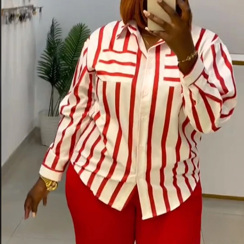 اشتر GX7639 بلوزة مخططة أنيقة للربيع والخريف مقاس كبير، كارديجان فضفاض بصف واحد من الأزرار، ياقة بولو، قميص بأكمام طويلة للنساء من منتجات الملابس والاكسسوارات من مصنع الصين مباشرة عبر الرابط