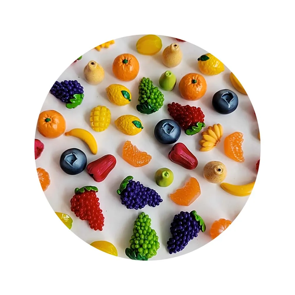 مجموعة جديدة من 100 قطعة/مجموعة من تماثيل الفاكهة الصغيرة ثلاثية الأبعاد الواقعية باللون البرتقالي والليمون والعنب والموز والخوخ والتوت الأزرق لمشروع DIY