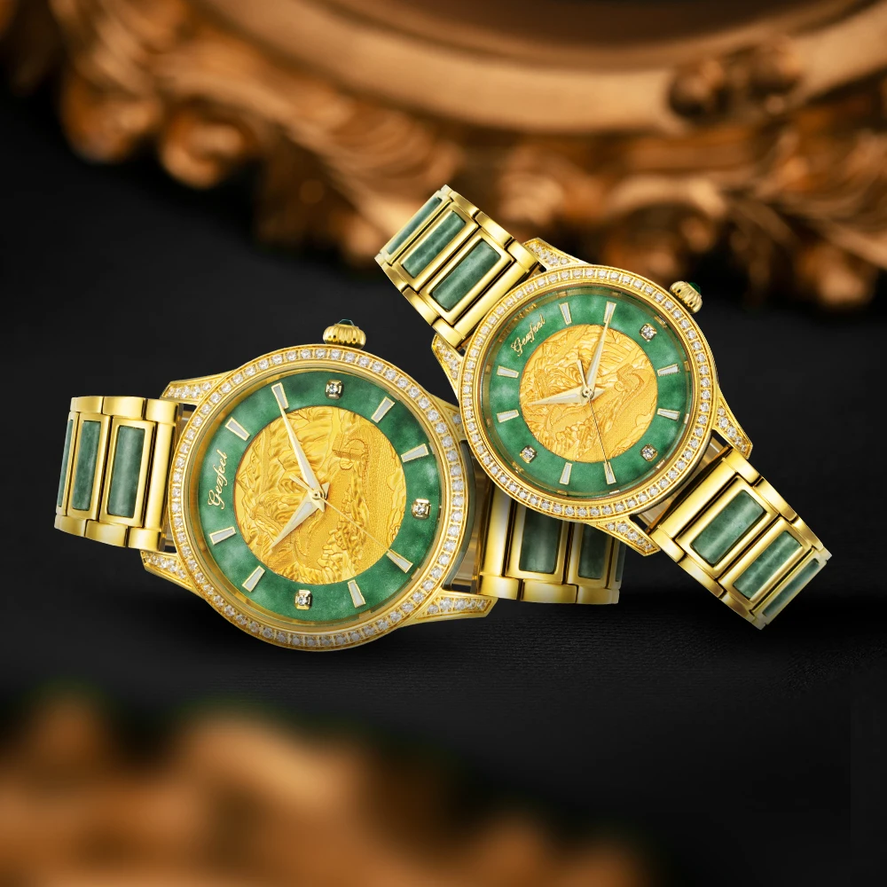 ساعات ميكانيكية للزوجين بمينا ذهبية ساعة أوتوماتيكية من اليشم الأخضر
