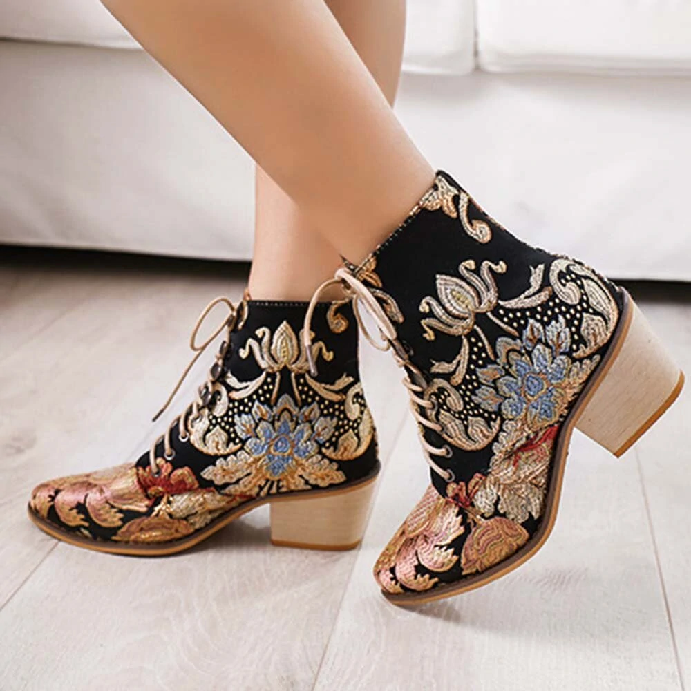 حذاء نسائي أنيق كبير الحجم بمقدمة مدببة مطرز برباط بطول الكاحل وكعب عريض
